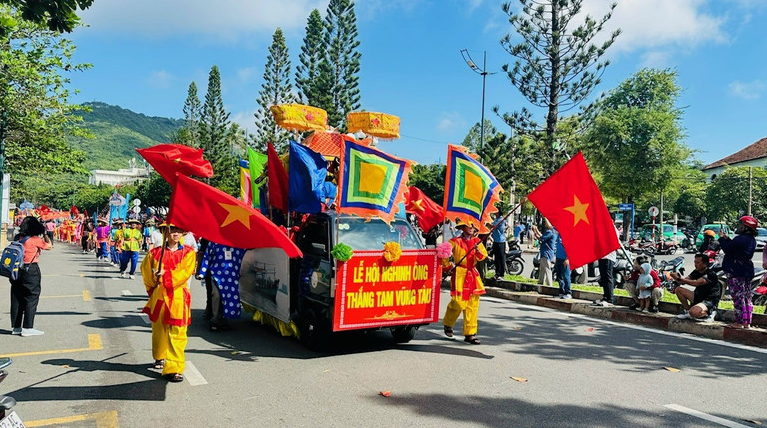 Đoàn diễu hành Nghinh Ông Thắng Tam trên đường phố Quang Trung sáng 7/10/2025.