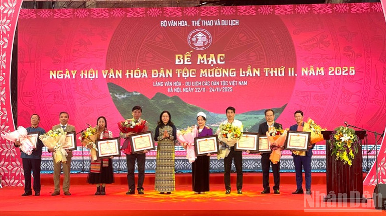 Thứ trưởng Văn hóa, Thể thao và Du lịch Trịnh Thị Thủy trao tặng bằng khen cho 8 tập thể tham gia ngày hội.